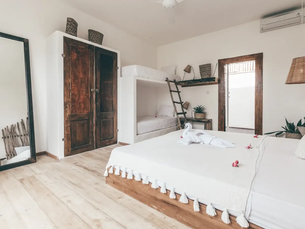 double beds, and theme with a bunk bed.